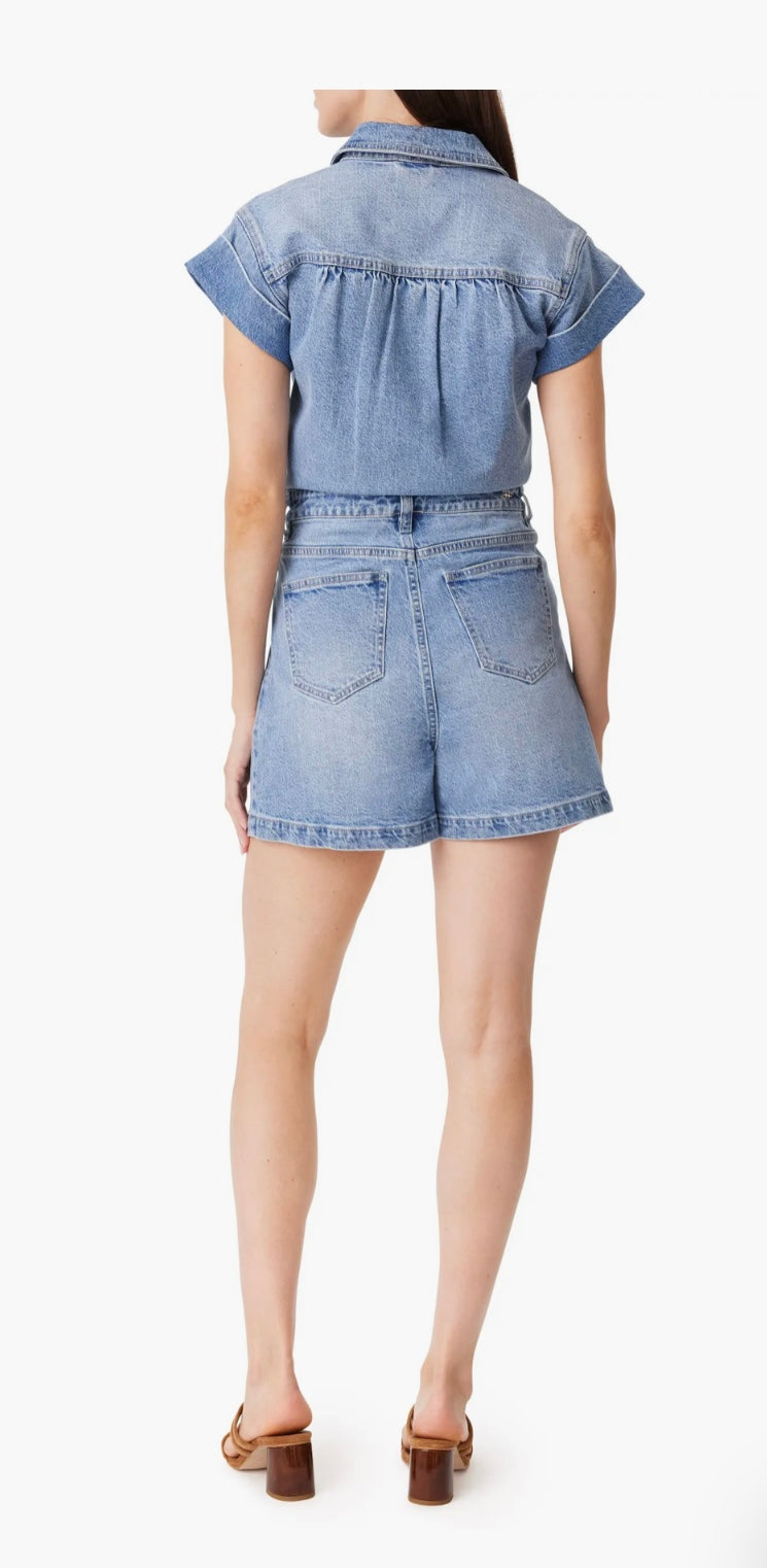 Utilitarian style meets casual charm in this button-front jumpsuit fashioned with front pleats and rolled cuffs at the sleeves.