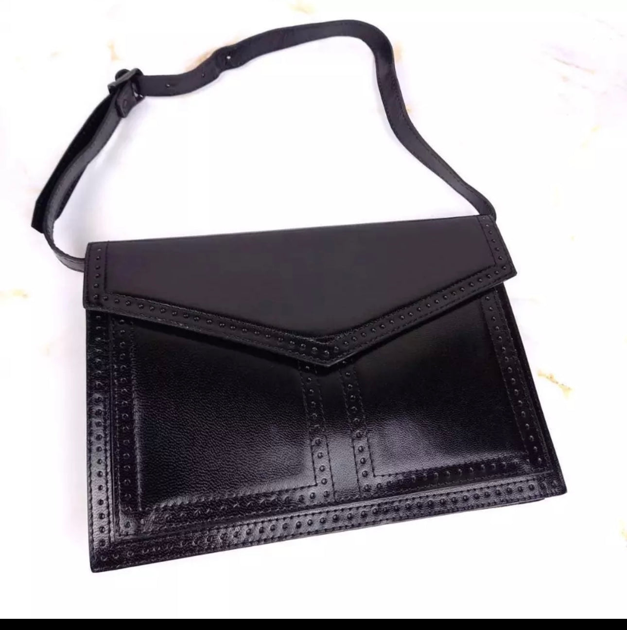 This shoulder bag features a leather body, a flat leather strap, a front flap with magnetic snap closure, and interior zip and slip pockets.